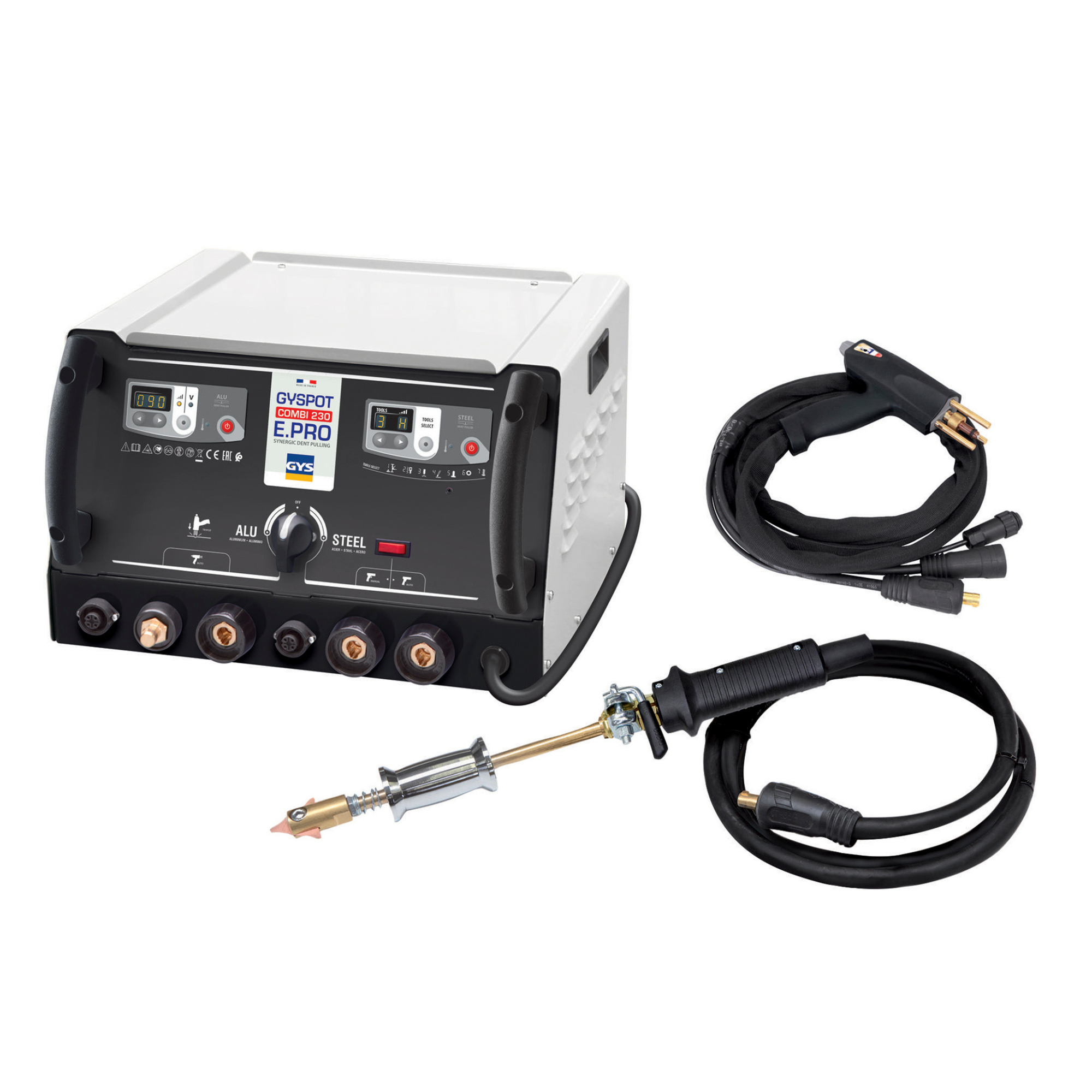 New generation 2 in 1 dent pulling machine. The Gyspot COMB I 230 PRO allows dent pulling on both steel and aluminum car bodies. A new repair process using mono-point and multi -point traction saves time and increases profitability. This process does not require any disassembly or trim removal.